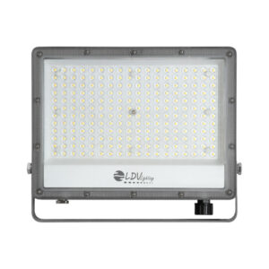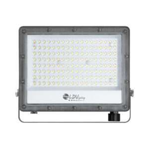Proyector LED KADO para exterior, 150W de potencia y luminosidad de 18000lm. Equipado con 216 Chips LED LUMILEDS. Apertura óptica simétrica de 120º y 3 temperaturas de color de color seleccionables mediante DIP switch. Grado de protección frente a elementos externos IP65 y grado de protección de resistencia mecánica a impactos IK09. Cuerpo fabricado en aluminio de acabado gris y lente de policarbonato transparente. Certificado CE & ROHS