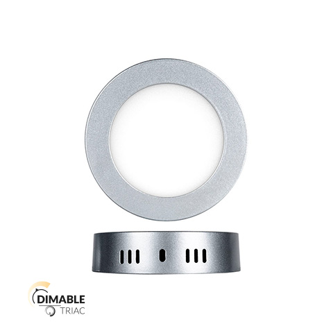 Downlight LED superficie redondo dimable con sistema de regulación TRIAC. 6w de potencia y luminosidad de 588lm. Apertura óptica de 180º con distribución del flujo lumínico simétrico, y temperatura de 4500K Grado de protección frente IP44, grado de resistencia mecánica IK06 y protección de sobretensión de 2KV. Fabricado en aluminio de acabado cromo mate y difusor de policarbonato de acabado opal. Certificado CE & ROHS
