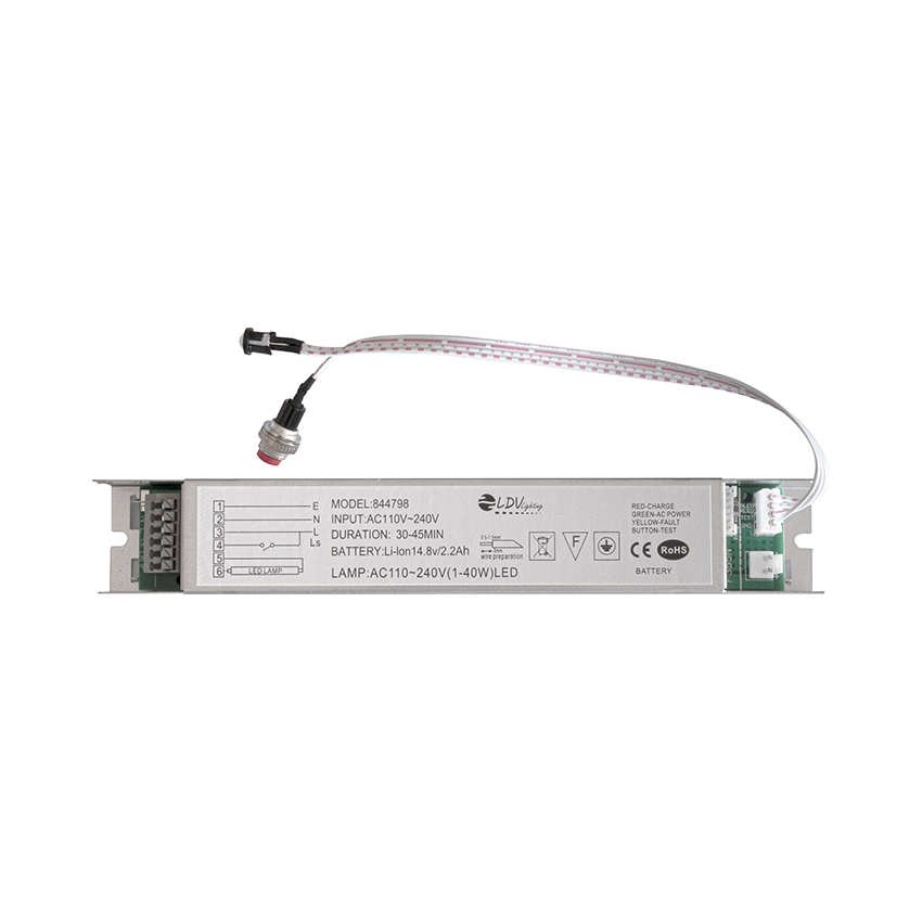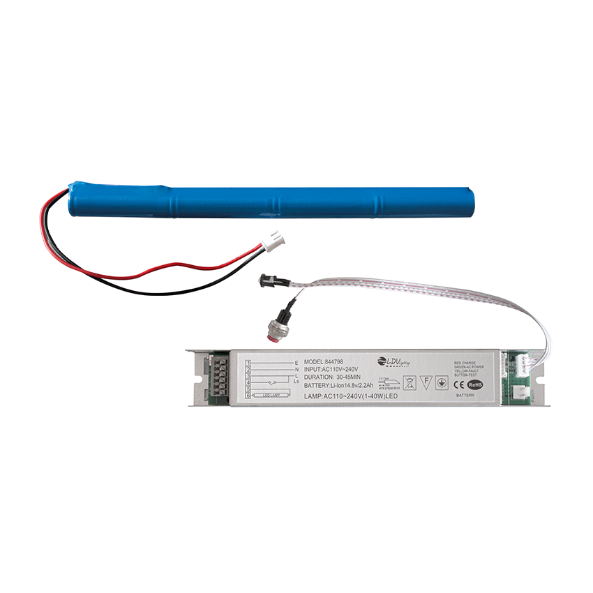 | Kit de emergencia LED Full Power con batería externa, diseñado para luminarias de 5 a 40W, ofreciendo el 100% de la potencia de carga en modo de emergencia. Su autonomía varía según la carga: más de 5 horas para cargas menores a 5W, y hasta 30 minutos para 30-40W. Funciona con entrada AC 85-265V (50/60Hz), conversión rápida en menos de 5 segundos y recarga completa en 24 horas. Incorpora batería Li-ion de 14,8V y 2,2Ah, externa al driver y con botón de auto-test incluido. Certificado CE & ROHS | |