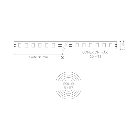 Tira de LED flexible con tensión DC24V. Cada metro está montado con 180 diodos del led chip modelo SMD2835 y una potencia de 15,5w/m. Color de temperatura 3000K, luminosidad de 1783lm/m e índice de protección IP20. Certificado CE & ROHS