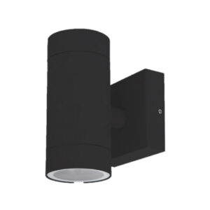 Aplique modelo LAGOS para dos lámparas de hasta 8W de potencia y casquillo GU10. Instalación en superficie y apta para exteriores con un índice de protección IP54. Grado de protección de resistencia mecánica a impactos IK08. Distribución de iluminación indirecta hacia arriba y abajo. Cuerpo de aluminio de acabado negro y difusor de cristal transparente. Certificado CE & ROHS