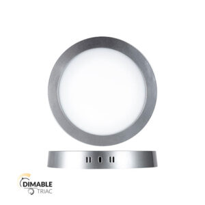 Downlight LED superficie redondo dimable con sistema de regulación TRIAC. 18w de potencia y luminosidad de 1728lm. Apertura óptica de 180º con distribución del flujo lumínico simétrico, y temperatura de 3000K Grado de protección frente IP44, grado de resistencia mecánica IK06 y protección de sobretensión de 2KV. Fabricado en aluminio de acabado cromo mate y difusor de policarbonato de acabado opal. Certificado CE & ROHS